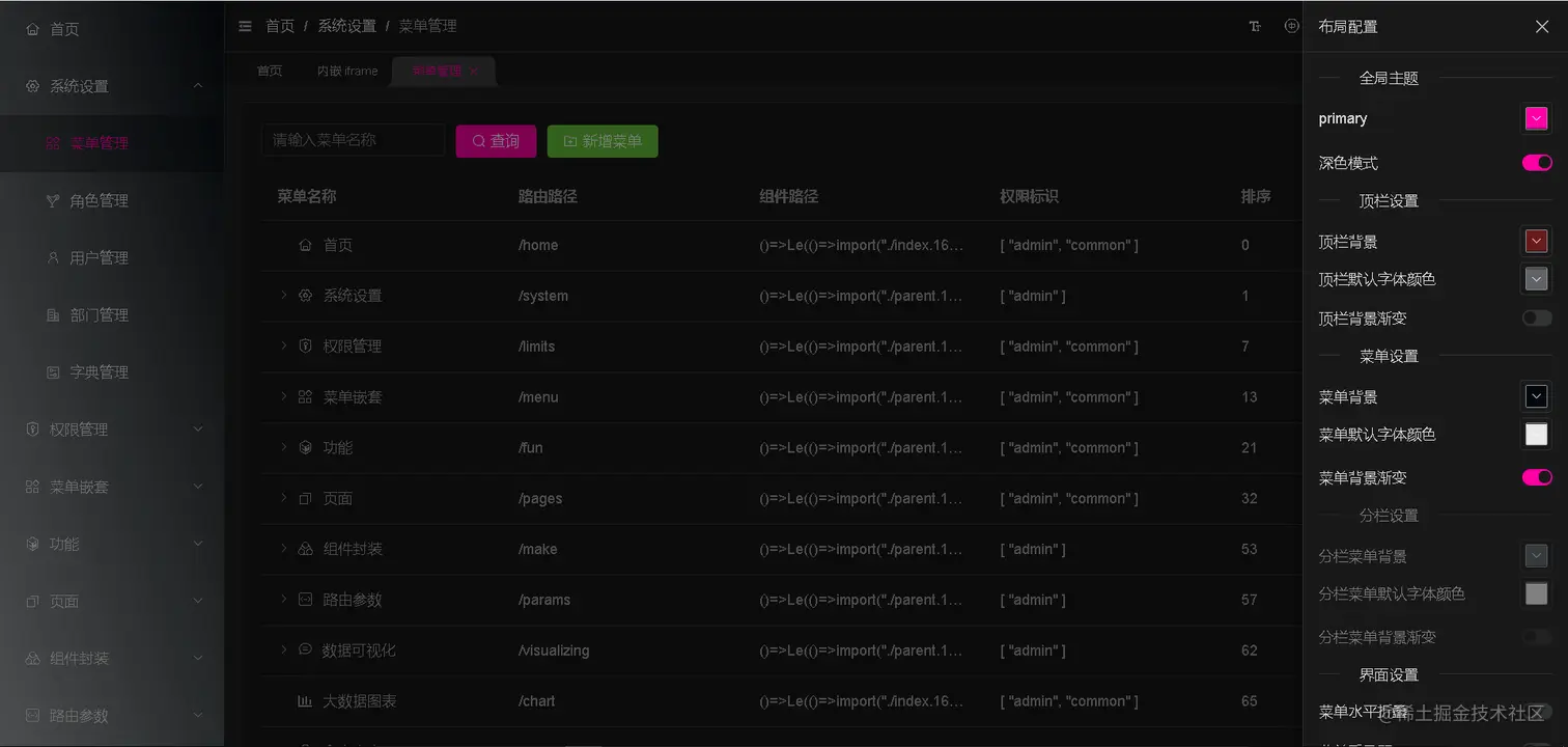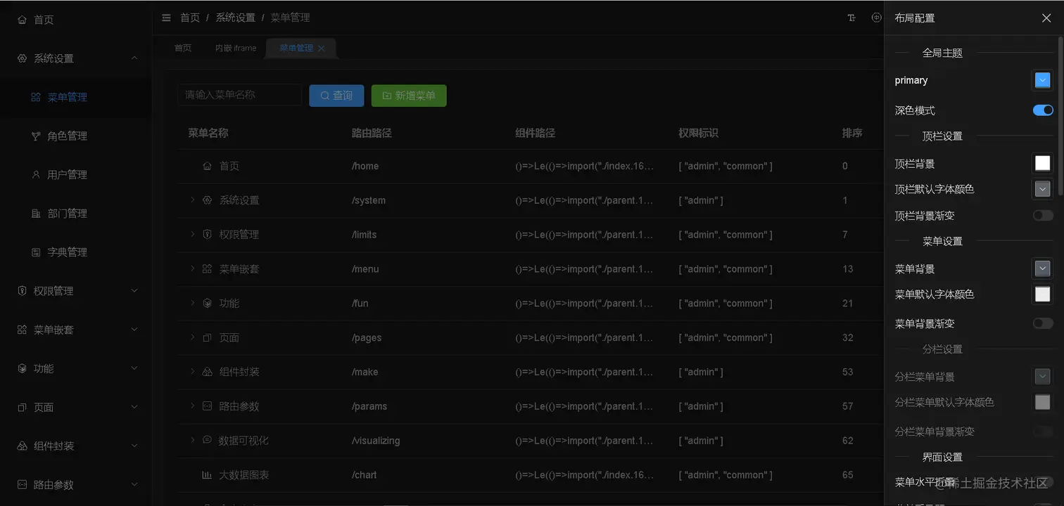 - 菜单管理:实现用户动态菜单配置,实现不同角色不同菜单。