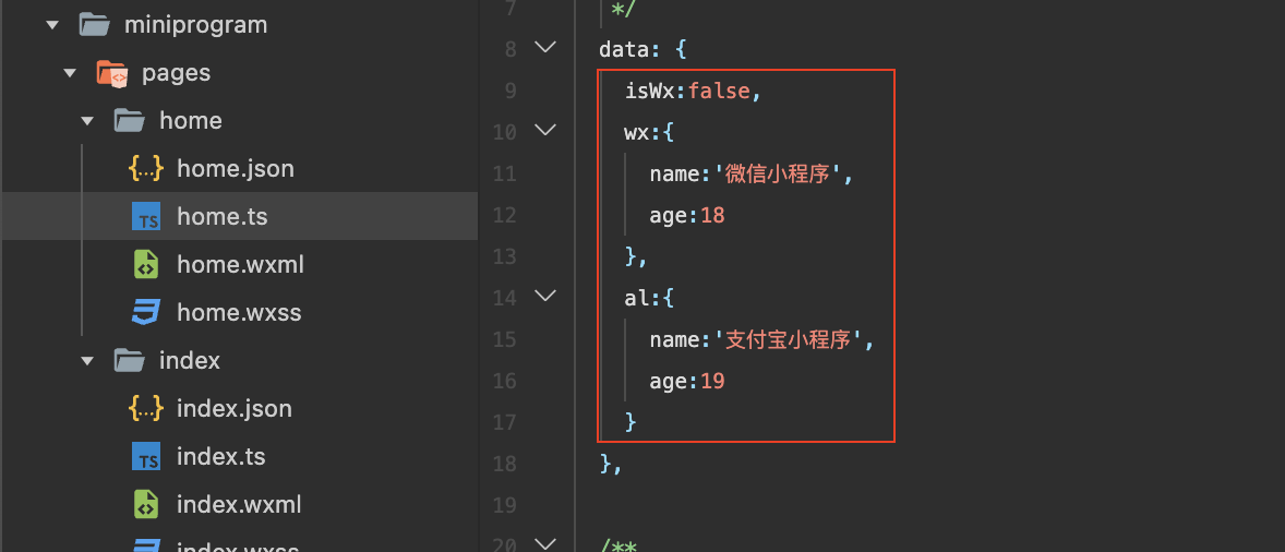 wx:if="{{}}" <!--注意:这里给Vue有所不同,这里引入变量也需要加{{ }} -->