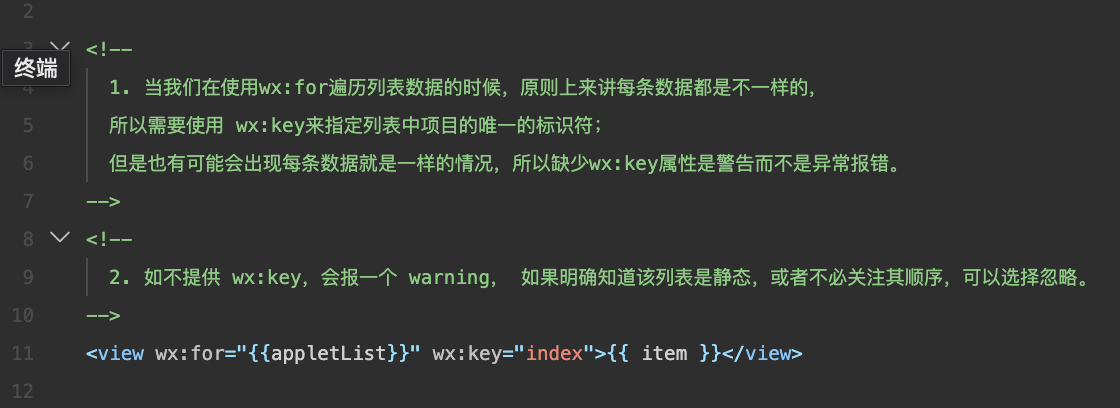 wx:for="{{ list }}" wx:key="index" {{ item }} {{ index }}