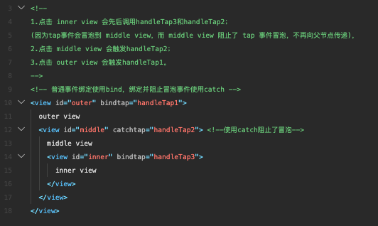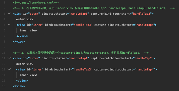 捕获阶段位于冒泡阶段之前,且在捕获阶段中,事件到达节点的顺序与冒泡阶段恰好相反。需要在捕获阶段监听事件时,可以采用capture-bind、capture-catch关键字,后者将中断捕获阶段和取消冒泡阶段。
