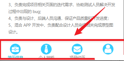 { "pages": [ "pages/hone/hone", "pages/Profile/Profile", "pages/experience/experience", "pages/skill/skill", "pages/index/index", "pages/logs/logs" ], "tabBar": { "color": "#777", "selectedColor": "#1cb9ce", "list": [ { "pagePath": "pages/hone/hone", "text": "简历信息", "iconPath": "/pages/img/icon08.png", "selectedIconPath": "/pages/img/icon08.png" }, { "pagePath": "pages/skill/skill", "text": "个人技能", "iconPath": "/pages/img/icon04.png", "selectedIconPath": "/pages/img/icon04.png" }, { "pagePath": "pages/experience/experience", "text": "项目经历", "iconPath": "/pages/img/icon02.png", "selectedIconPath": "/pages/img/icon02.png" }, { "pagePath": "pages/Profile/Profile", "text": "自我评价", "iconPath": "/pages/img/icon06.png", "selectedIconPath": "/pages/img/icon06.png" } ] }, "window": { "backgroundTextStyle": "light", "navigationBarBackgroundColor": "#fff", "navigationBarTitleText": "Weixin", "navigationBarTextStyle": "black" }, "style": "v2", "sitemapLocation": "sitemap.json" }