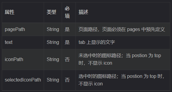 ③ 在 list 数组中, 新增每一个 tab 项的配置对象 。对象中包含的属性如下: pagePath 指定当前 tab 对应的页面路径 【 必填 】
