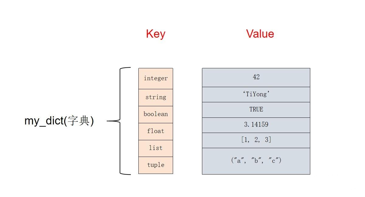 首先,来看一张图,字典的结构就如同下面的这张图,{ }(大花括号)用来声明字典。字典中的每一个元素都是由键值对组成,也就是Key:Value的组合。这里的冒号 : 是用来分割键值对的。同时,Value元素的类型,可以是任何类型的组合。