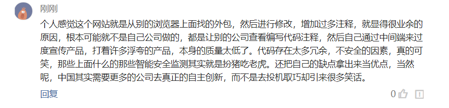 个人感觉这个网站就是从别的浏览器上面找的外包,然后进行修改,增加过多注释,就显得很业余的原因,根本可能就不是自己公司做的,都是让别的公司查看编写代码注释,然后自己通过中间端来过度宣传产品,打着许多浮夸的产品,本身的质量太低了。代码存在太多冗余,不安全的因素,真的可笑,那些上面什么的那些智能安全监测其实就是扮猪吃老虎。还把自己的缺点拿出来当优点,当然呢,中国其实需要更多的公司去真正的自主创新,而不是去投机取巧却引来很多笑话。