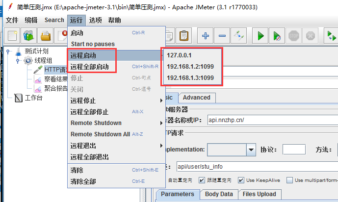 3.在顶部菜单-运行-远程启动中可以看到,负载机添加成功,启动时选择远程全部启动
