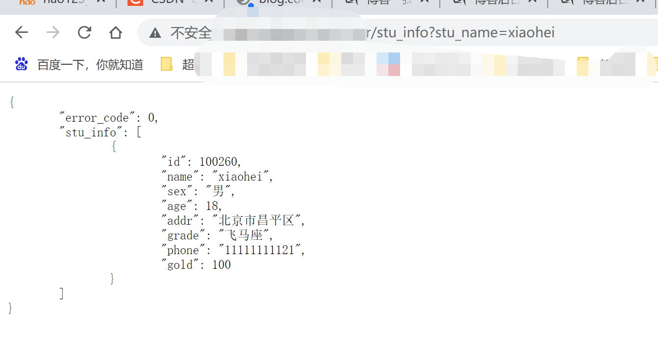 在浏览器http://api.nnzhp.cn/api/user/stu_info?stu_name=xiaohei,其中 http://api.nnzhp.cn为接口域名,/api/user/stu_info为接口地址,stu_name为接口参数,且必传 所以使用?(英文问号)拼接在接口地址后面,结果如下: