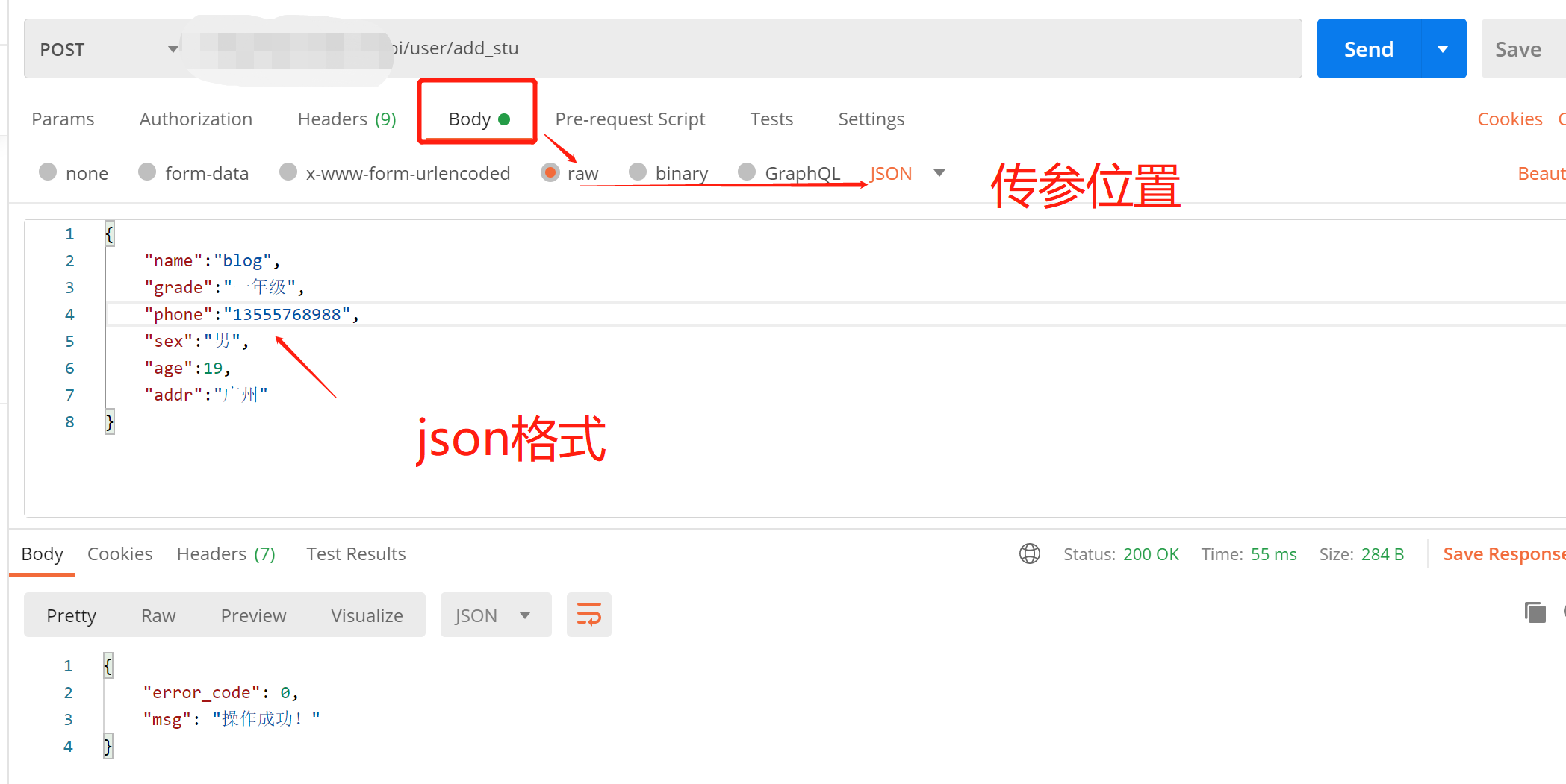 (2)json传参,当为json传参形式时,传参位置在body-raw ,最后面类型选为json形式,json书写方式: