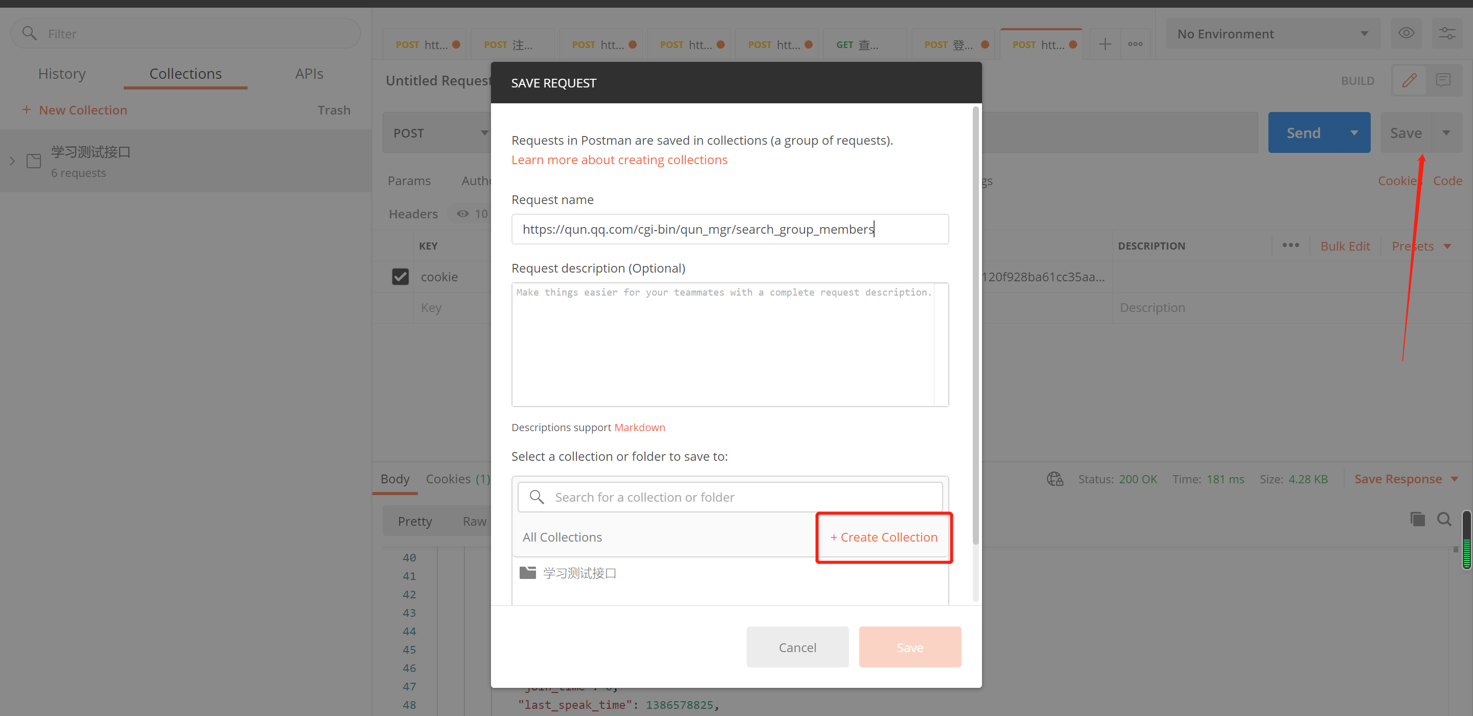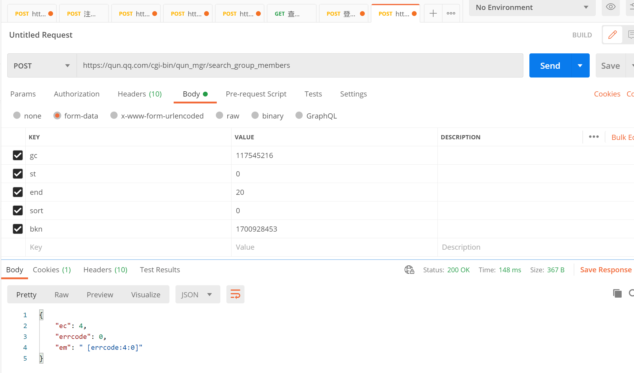 在qun.qq.com 找到群管理 选择一个群 通过f12找到群成员接口,使用抓取到的数据进行测试发现无法请求到成员列表,这种情况下查看f12里面数据 是需要有登录信息,但是该接口没有需要输入账号密码的字段 所以需要传cookie,所以需要在headder里面传cookie 复制抓取到的cookie