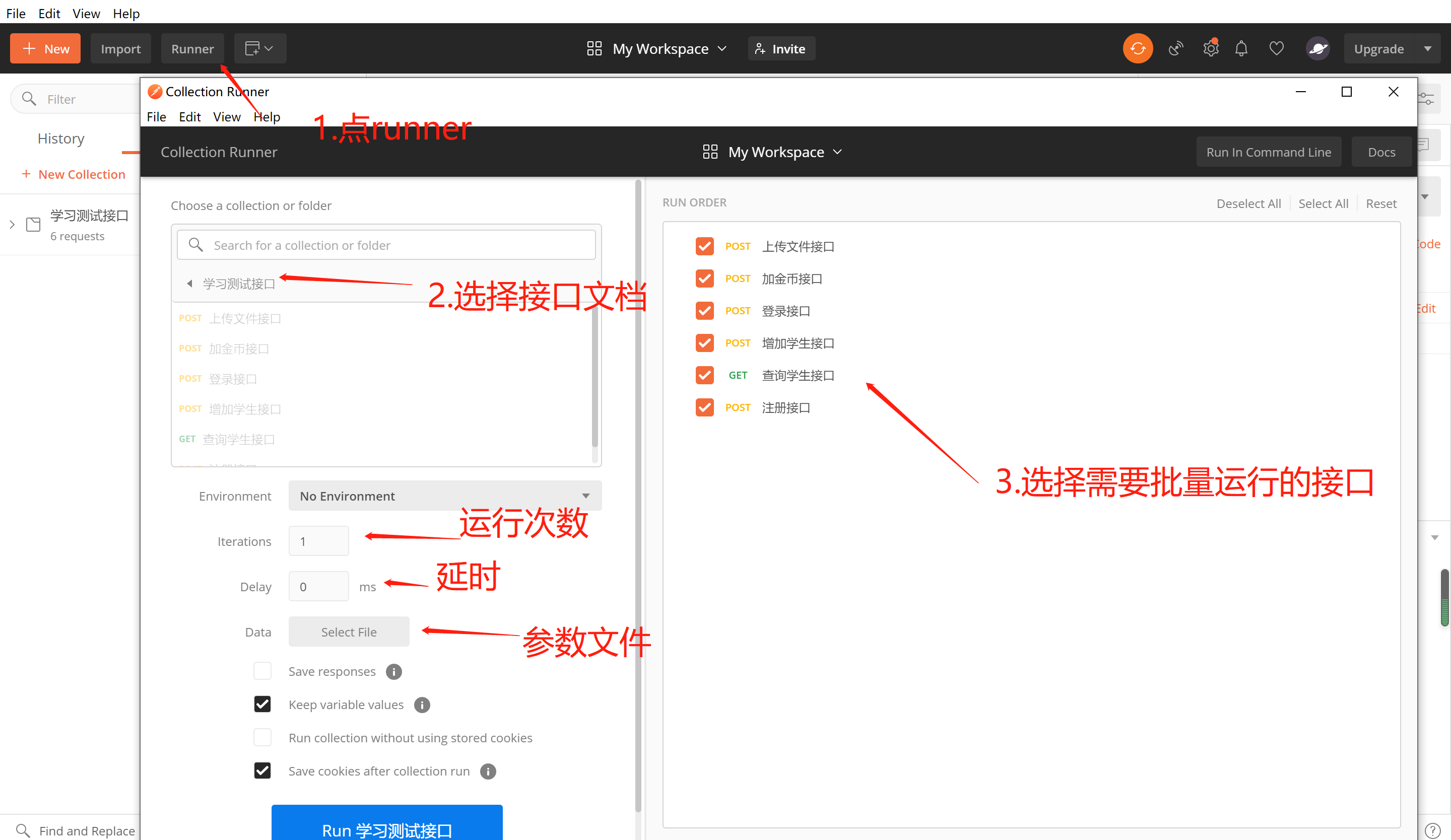 第一步:找到批量运行接口入口:如下图runner--选择接口文档--选择需要运行的接口