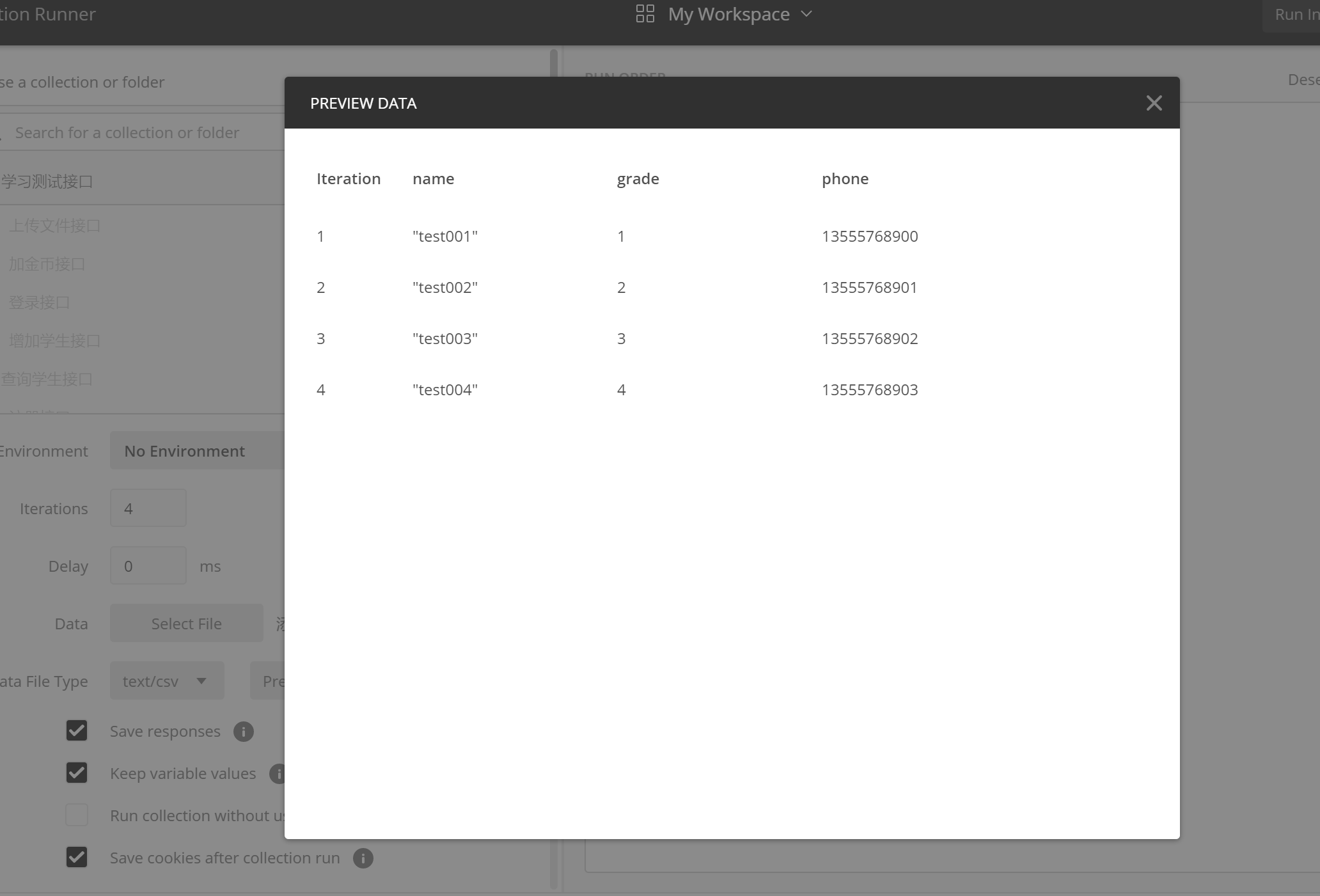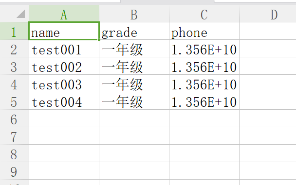 第二步:准备文档:例如添加学生接口,添加学生接口字段有name,grade,phone三个字段为必填,sex,age,addr三个字段选填,,首先创建文件用于保存接口参数值,可以创建txt文档或者csv文档,此处使用csv文档,如图,表头代表变量名称,用于引用