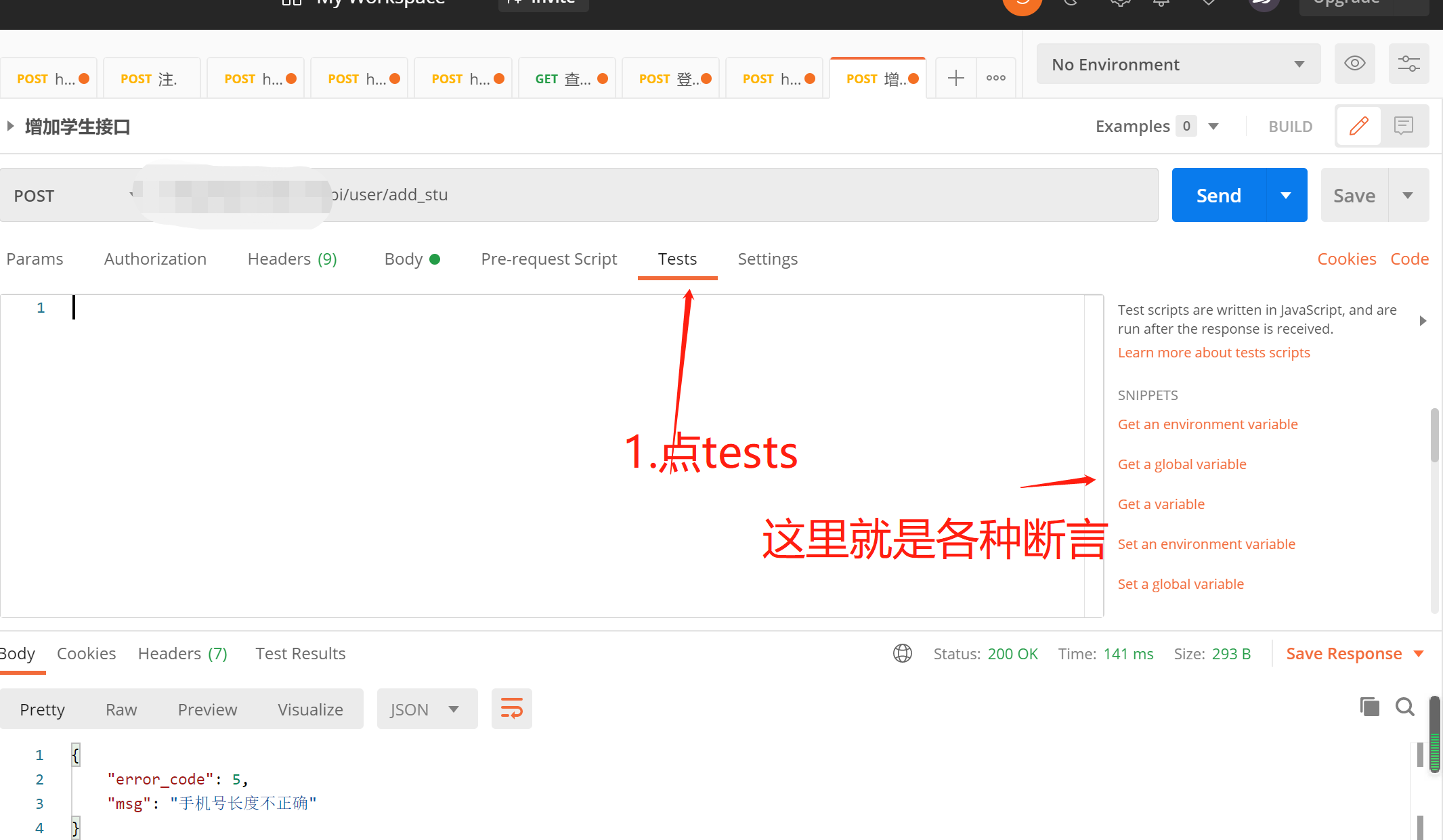 (2)设置断言:在接口测试页面--点击test 既可以看到各种断言