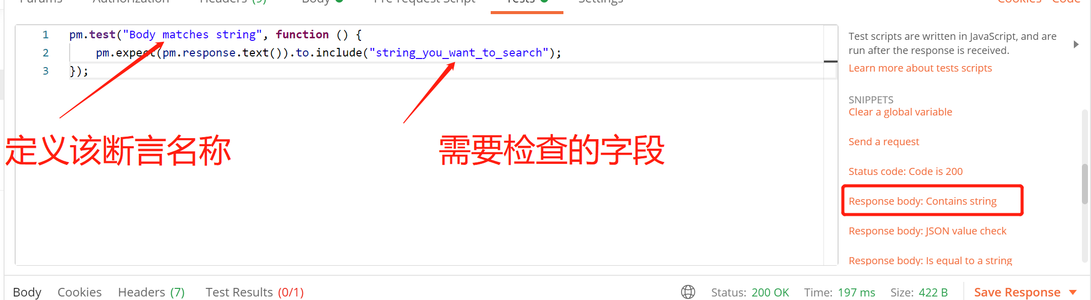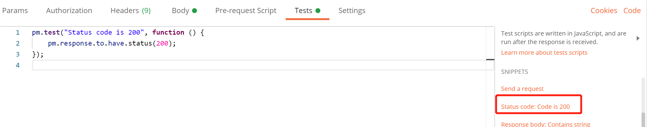 第一类:status code:code is 200 用于判断相应状态码是否为200 ,点击后就会自动填写相应断言代码