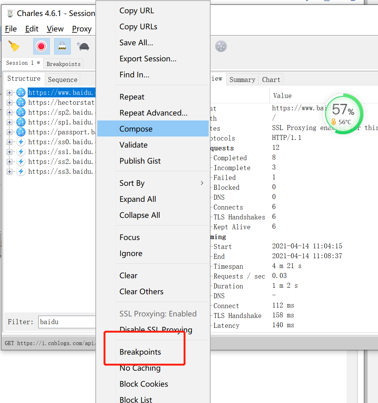 4.断点:拦截数据修改数据,以百度为例,选择百度网址,右键 勾选breakpoints