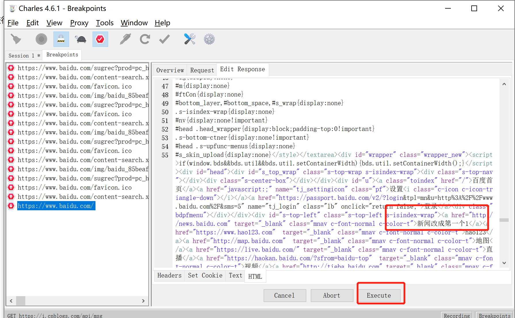 然后浏览器请求该网址,会在charles上进行拦截,点击execute进行放行后,修改返回数据,找到对应需要修改数据 进行修改后 放行(execute)