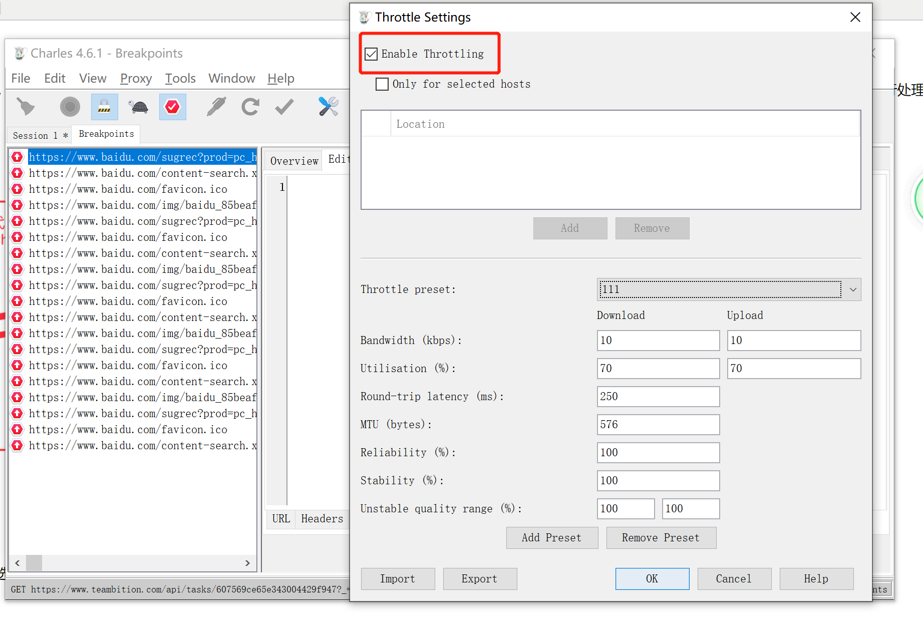 5.弱网测试:在proxy--throttle-Settings勾选enable throttling 选择对应网速 也可以自定义网速