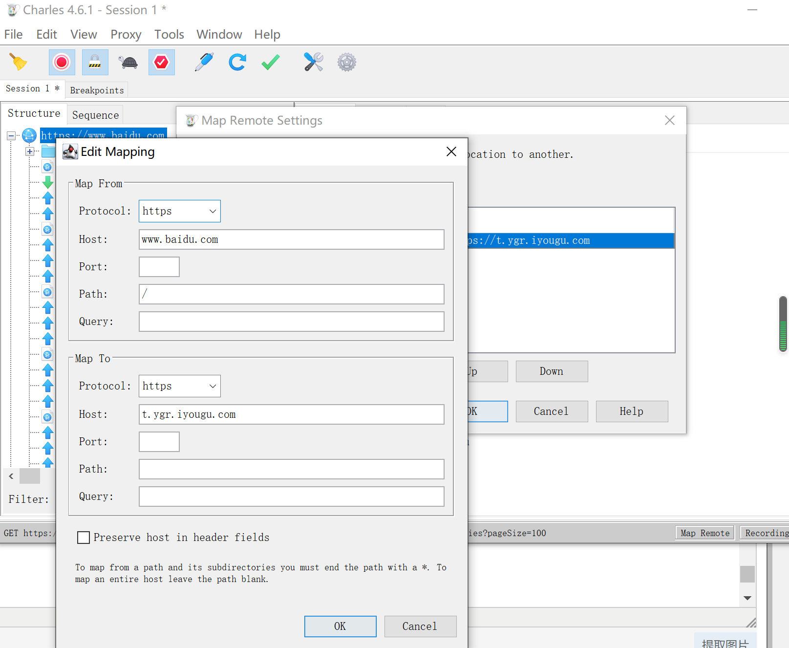 在tools--map remote settings设置,添加原本网址 输入 需要映射到的网址,保存后 在浏览器验证就可以得到结果