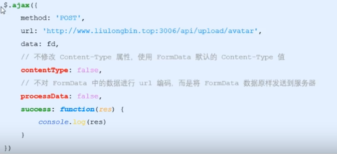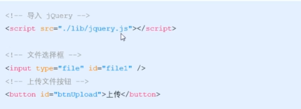 <!DOCTYPE html> <html lang="en"> <head> <meta charset="UTF-8"> <meta http-equiv="X-UA-Compatible" content="IE=edge"> <meta name="viewport" content="width=device-width, initial-scale=1.0"> <title>Document</title> <script src="/js文件/jquery-3.6.0.js"></script> </head> <body> <input type="file" id="file1"> <button id="butUpload">上传文件</button> </body> <script> $(function () { $('#btnUpload').on('click', function () { var files = $('#file1')[0].files if (files.length <= 0) { return alert('请选择文件后再上传') } var fd = new FormData() fd.append('avatar', files[0]) // 发起jQuery的AJAX请求,上传文件 $.ajax({ method: 'POST', url: 'http://www.liulongbin.top:3006/api/upload/avatar', data: fd, processData: false, contentType: false, success: function (res) { console.log(res); } }) }) }) </script> </html>