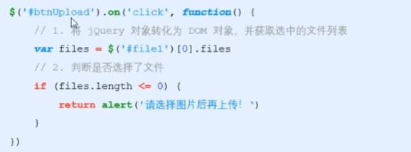 <!DOCTYPE html> <html lang="en"> <head> <meta charset="UTF-8"> <meta http-equiv="X-UA-Compatible" content="IE=edge"> <meta name="viewport" content="width=device-width, initial-scale=1.0"> <title>Document</title> <script src="/js文件/jquery-3.6.0.js"></script> </head> <body> <input type="file" id="file1"> <button id="butUpload">上传文件</button> <br> <img src="/img/1.jpg" alt="" style="display: none;" id="loading"> </body> <script> $(function () { // 监听到Ajax请求被发起了 $(document).ajaxStart(function () { $('#loading').show }) // 监听到Ajax完成的事件 $(document).ajaxStop(function () { $('#loading').hide() }) $('#btnUpload').on('click', function () { var files = $('#file1')[0].files if (files.length <= 0) { return alert('请选择文件后再上传') } var fd = new FormData() fd.append('avatar', files[0]) // 发起jQuery的AJAX请求,上传文件 $.ajax({ method: 'POST', url: 'http://www.liulongbin.top:3006/api/upload/avatar', data: fd, processData: false, contentType: false, success: function (res) { console.log(res); } }) }) }) </script> </html>