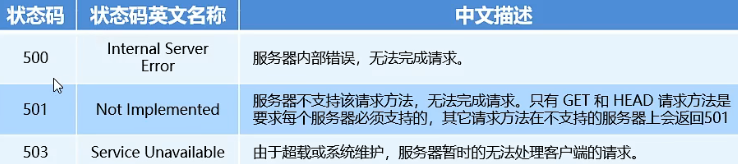 5*范围的状态码,表示服务器未能正常处理客户端的请求而出现意外错误。常见的5**类型的状态码如下: