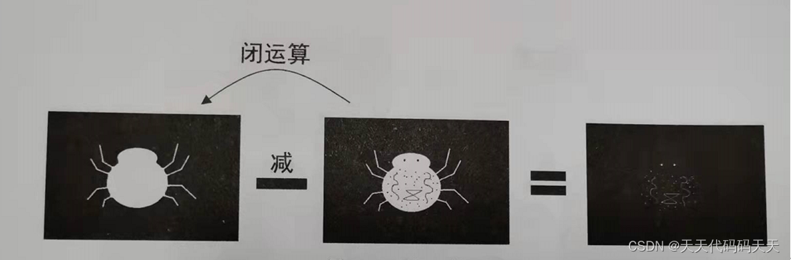 黑帽运算就是让原图的闭运算图像减去原图,闭运算会抹除图像的内部细节,“无外部细节”的图像减去“有内部细节”的图像,得到的结果就剩内部细节了。