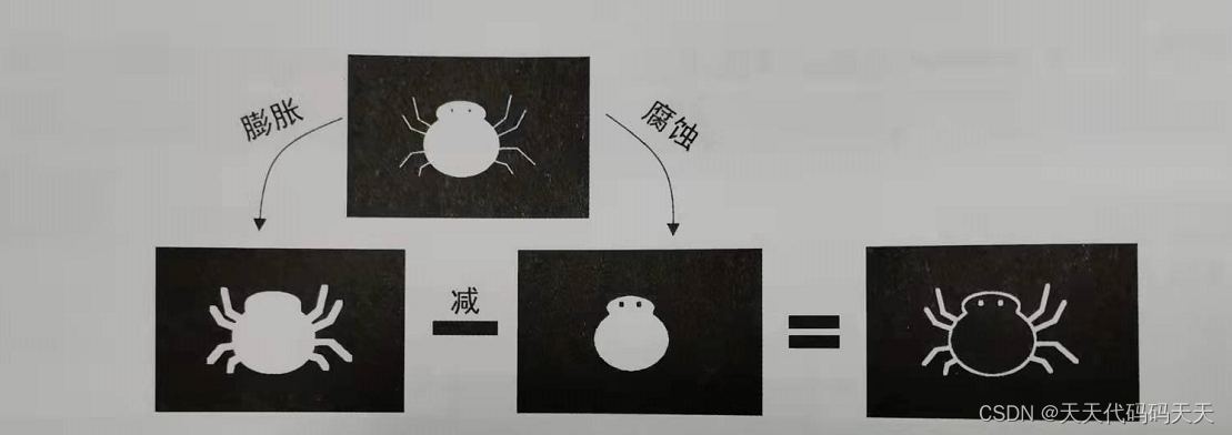 梯度运算的过程是让原图的膨胀图像减去原图的腐蚀图像,因为膨胀图比原图大,腐蚀图比原图小,利用腐蚀图将膨胀图像掏空,就得到了原图的轮廓图像。
