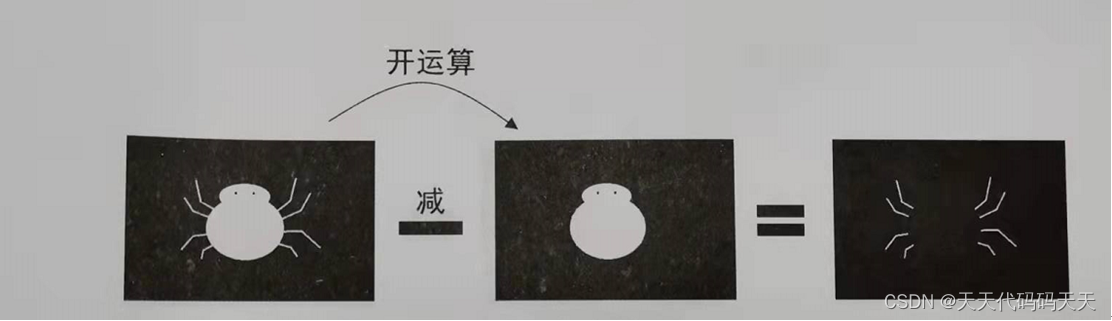 顶帽运算就是让原图减去原图的开运算图像,开运算会抹除图像的外部细节,“有外部细节”的图像减去“无外部细节”的图像,得到的结果就只剩外部细节了。