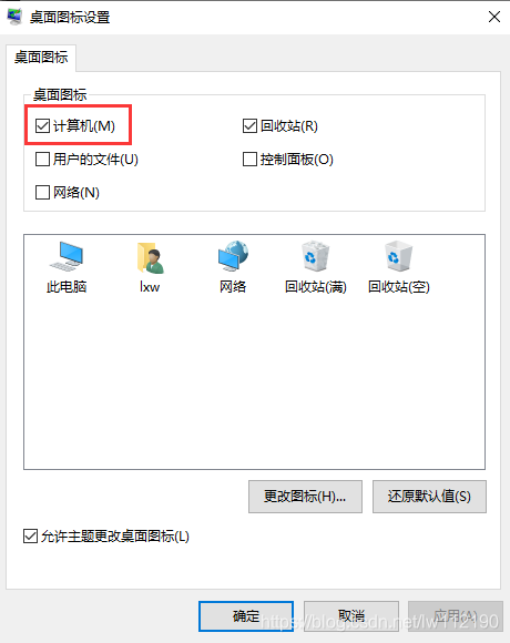 点击【桌面图标设置】,会弹出一个对话框,该对话框有可以设置显示的图标,例如计算机、回收站、用户的文件、控制面板等。