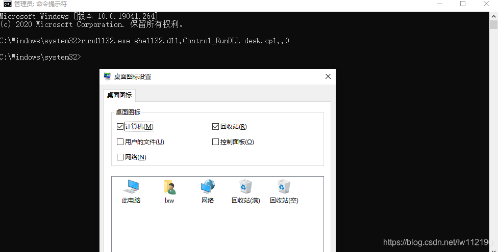 以管理员身份运行cmd,输入rundll32.exe shell32.dll,Control_RunDLL desk.cpl,,0 即可调出桌面图标设置。