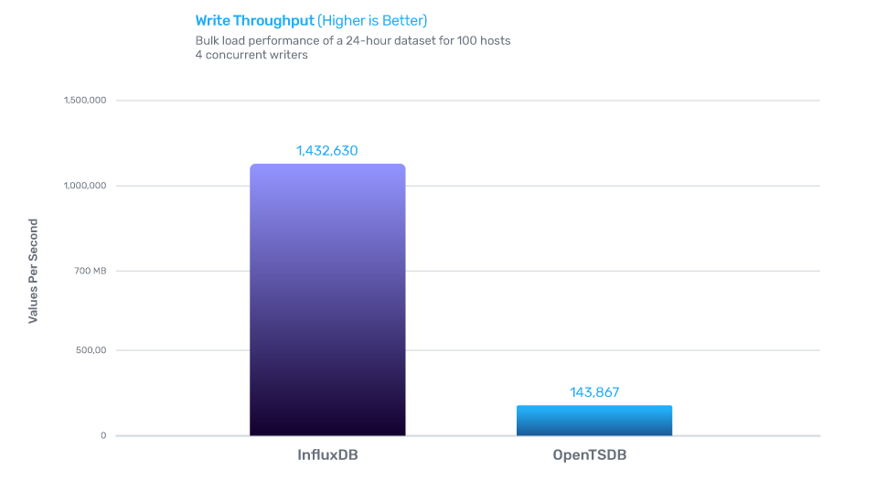 InfluxDB的写性能是OpenTSDB的5倍,存储效率是OpenTSDB的16.5倍,查询效率是OpenTSDB的3.65倍。