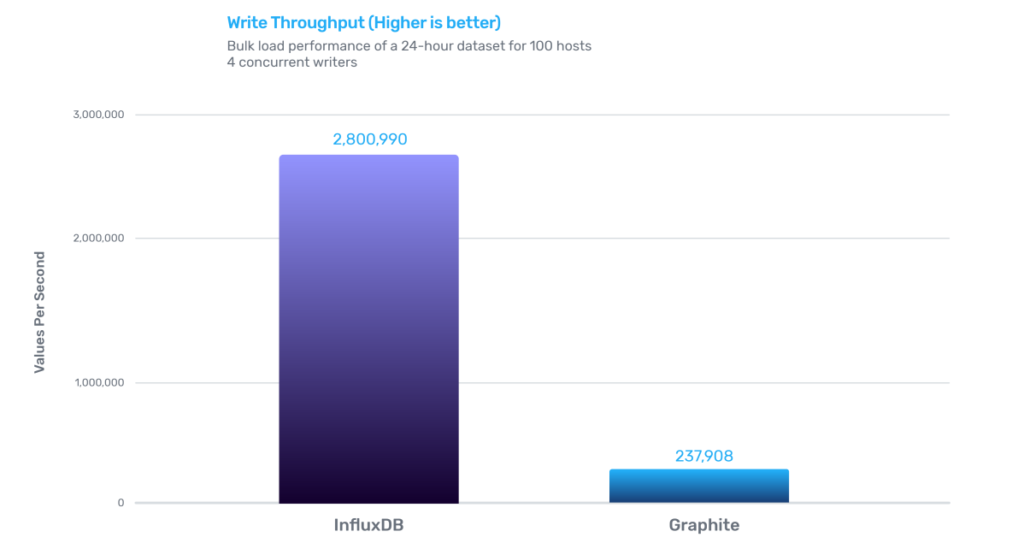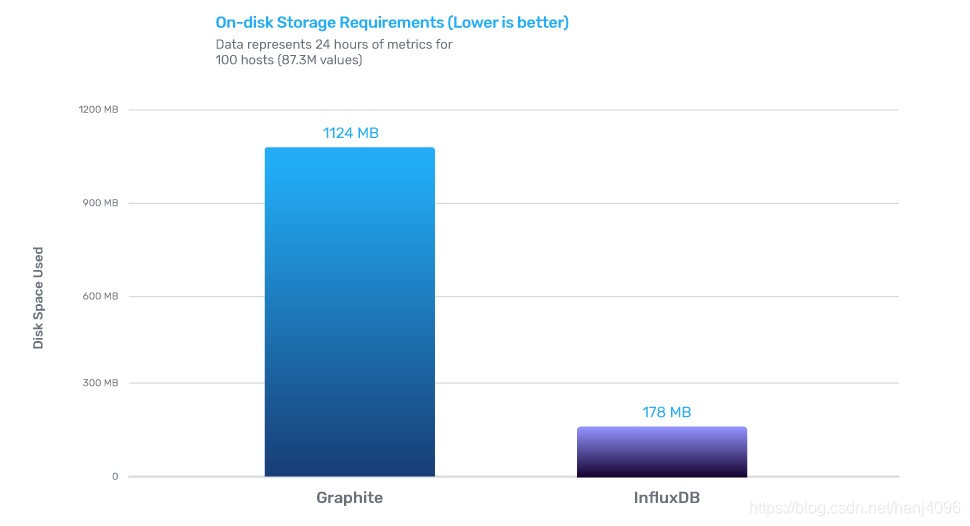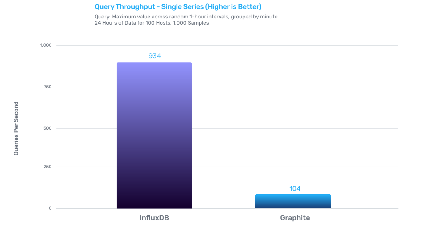 InfluxDB的写性能是Graphite的12倍,存储效率是Graphite的6.3倍,查询效率是Graphite的9倍。
