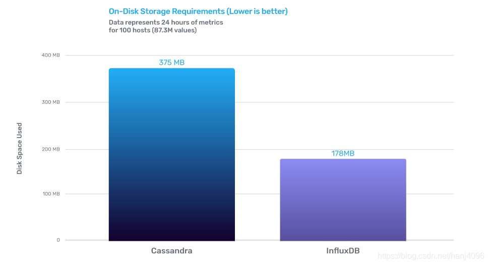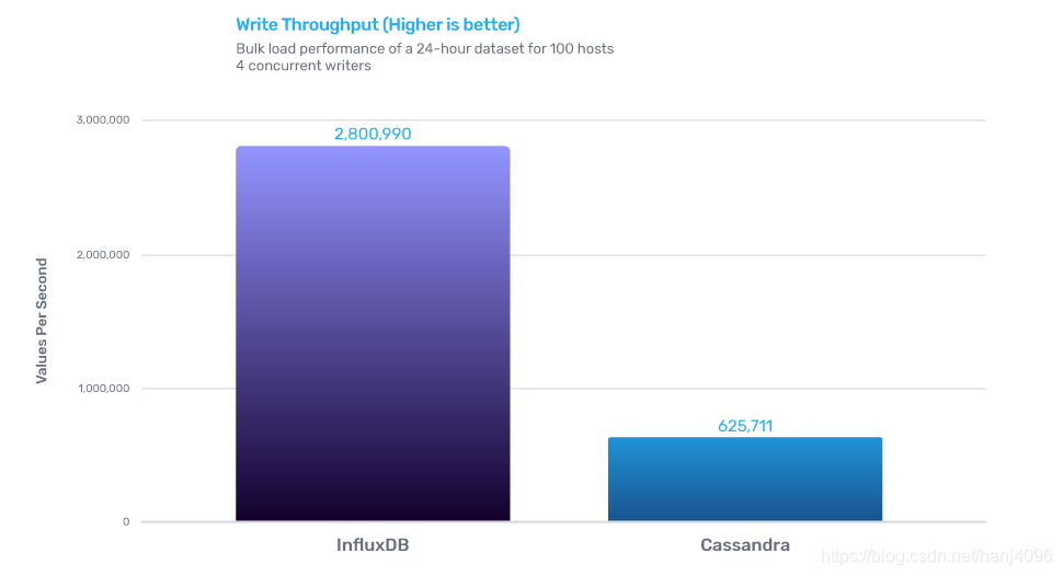 InfluxDB的写性能是Cassandra的4.5倍,存储效率是Cassandra的2.1倍,查询效率是Cassandra的45倍。