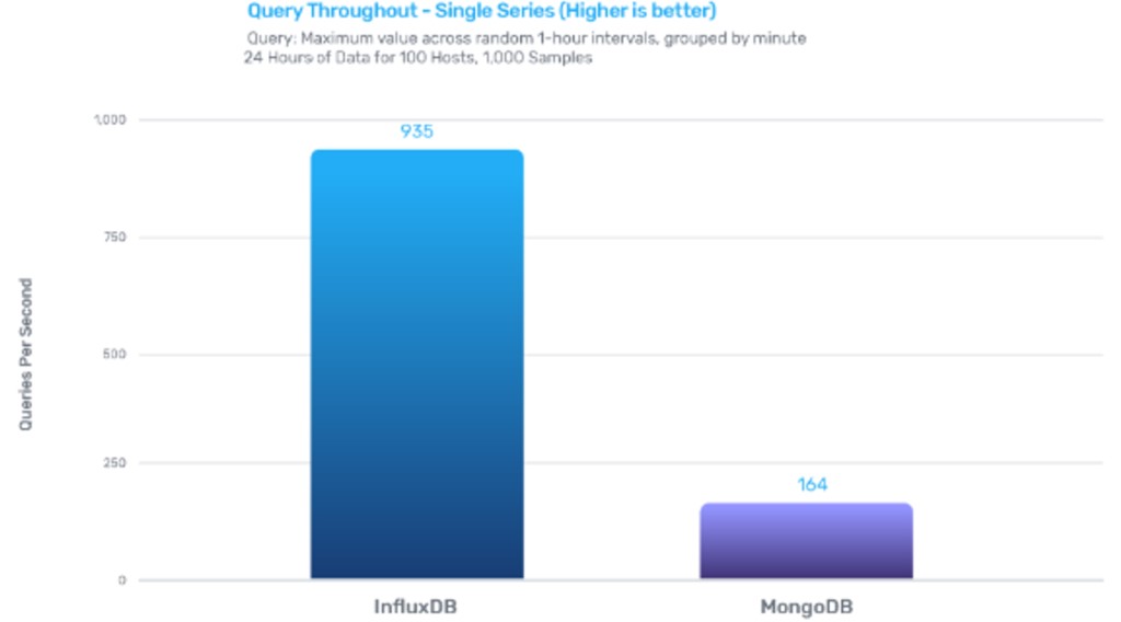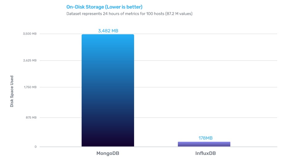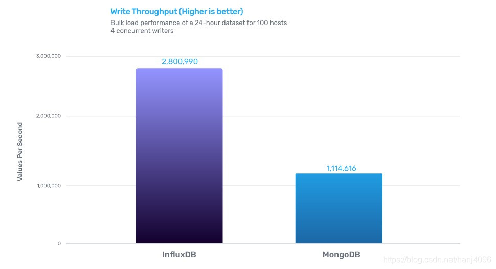 InfluxDB的写性能是MongoDB的2.4倍,存储效率是MongoDB的20倍,查询效率是MongoDB的5.7倍。
