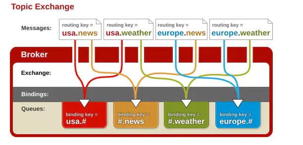 前面讲到direct类型的Exchange路由规则是完全匹配binding key与routing key,但这种严格的匹配方式在很多情况下不能满足实际业务需求。topic类型的Exchange在匹配规则上进行了扩展,它与direct类型的Exchage相似,也是将消息路由到binding key与routing key相匹配的Queue中,但这里的匹配规则有些不同,它约定: