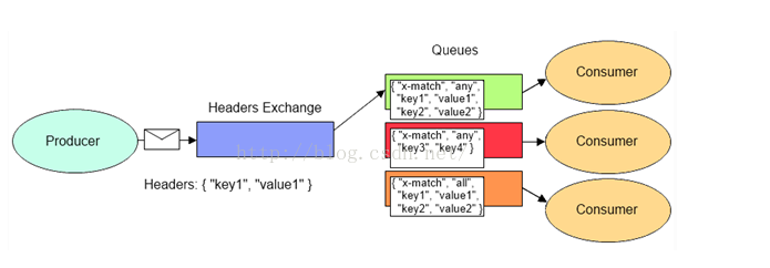 在绑定Queue与Exchange时指定一组键值对;当消息发送到Exchange时,RabbitMQ会取到该消息的headers(也是一个键值对的形式),对比其中的键值对是否完全匹配Queue与Exchange绑定时指定的键值对;如果完全匹配则消息会路由到该Queue,否则不会路由到该Queue。