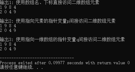 printf("\n输出3: 使用指向一维数组的指针变量q间接访问二维数组元素\n");