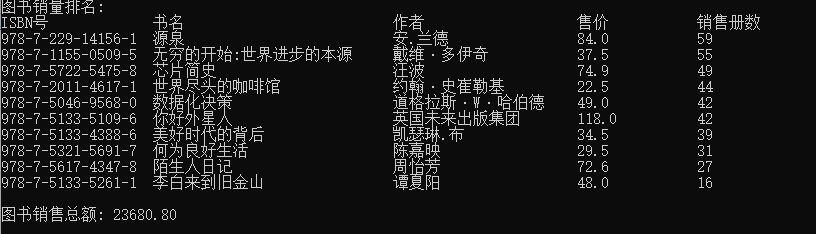 printf("ISBN号 书名 作者 售价 销售册数\n");