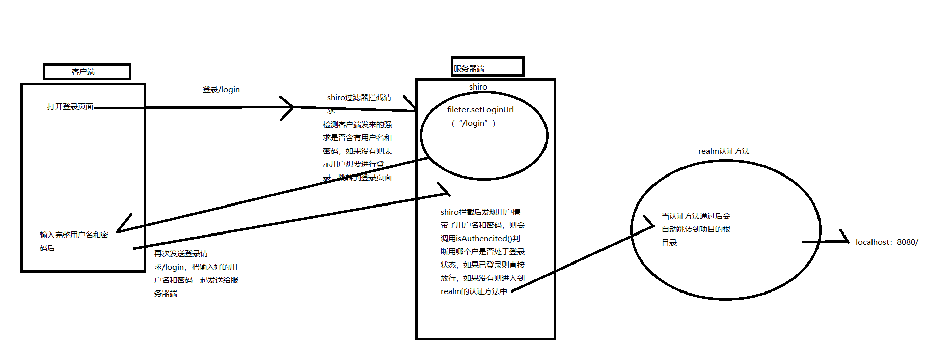 shiro的核心是过滤器,因此使用shiro进行功能实现时首先进行的应该是拦截。举个例子,当用户打开登录页面时会发送一个请求,此时的请求中没有用户名和密码,在进行认证前shiro会将此次请求拦截并检测请求是否携带用户名和密码,如果不带则跳转到登录页面让用户输入完整的用户名和密码,当用户输入完整的用户名和密码后发送登录请求,此时的请求中携带用户名和密码,当请求再次被shiro拦截时,shiro会检测到用户名和密码,然后shiro会调用isAuthencited()方法判断用户是否处于登录状态,如果是则直接放行,如果不是则会进入到realm认证方法中登录认证。下面是流程图: