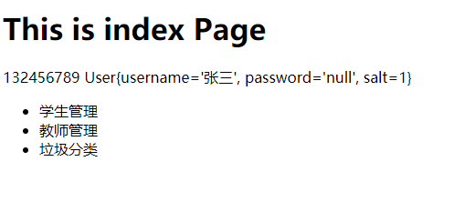 <!DOCTYPE html> <html xmlns="http://www.w3.org/1999/xhtml" xmlns:th="http://www.thymeleaf.org" xmlns:sec="http://www.thymeleaf.org/thymeleaf-extras-springsecurity4" xmlns:shiro="http://www.pollix.at/thymeleaf/shiro"> <head> <meta charset="UTF-8"> <title>index</title> </head> <body> <h1>This is index Page</h1> <shiro:guest> <h1>欢迎游客!</h1> </shiro:guest> <shiro:user>132456789</shiro:user> <shiro:principal/> <ul> <li>学生管理</li> <li>教师管理</li> <shiro:hasRole name="book_manager"> <li>图书管理</li> </shiro:hasRole> <li>垃圾分类</li> </ul> </body> </html>