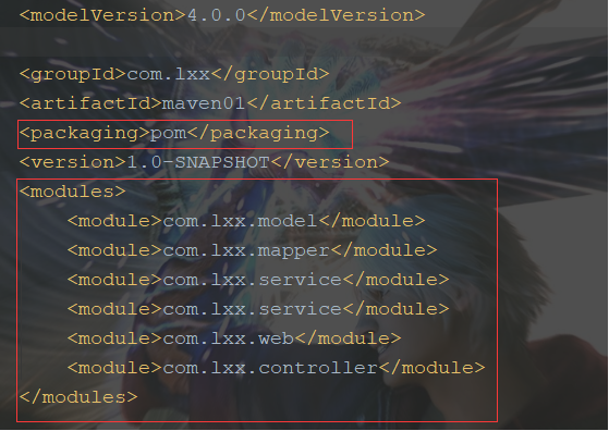 可以看到多了一个 packaging标签,里边加了个pom代表这是父工程,models里的便是父工程下边的各个子模块。