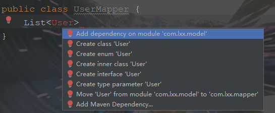 6.一旦开始使用分模块开发,之前的所有包都被分成了一个一个的子模块,如果我们还像以前哪样去引用某一个包的支持就会出现找不到的情况 例如我的mapper想要引用model里的user实体,但是却找不到如下: