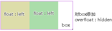 图二:对两个孩子使用float:left,我在上一篇浮动布局讲过,这是父元素会高度坍塌,所以要闭合浮动,对box使用overflow:hidden,效果如下: