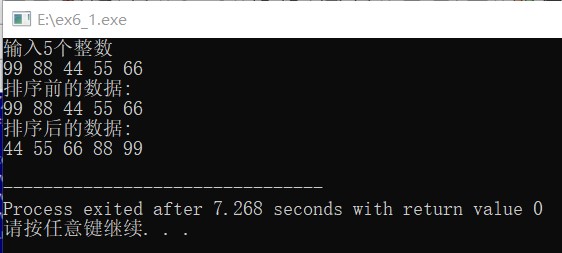 // 示例: 使用选择法排序对一组整数由小到大排序 #include <stdio.h> const int N=5; void selectSort(int [], int); // 函数声明(函数声明中可以省略变量名、数组名,但是数组名后面的[]不是能少) void input(int [], int); void output(int [], int); int main() { int a[N]; printf("输入%d个整数\n", N); input(a, N); printf("排序前的数据:\n"); output(a,N); selectSort(a,N); // 调用selectSort()对数组a中的N个元素排序 printf("排序后的数据:\n"); output(a, N); return 0; } // 函数定义 // 函数功能描述:输入n个整数到数组a中 void input(int a[], int n) { int i; for(i=0; i<n; i++) scanf("%d", &a[i]); } // 函数定义 // 函数功能描述:输出数组a中的n个整数 void output(int a[], int n) { int i; for(i=0; i<n; i++) printf("%d ", a[i]); printf("\n"); } // 函数定义 // 函数功能描述:使用选择法对数组a中的n个整数由小到大排序 void selectSort(int a[], int n) { int i, j, k, temp; for(i=0; i<n-1; i++) { k = i; // k用于记录当前最小元素的下标 for(j=i+1; j<n; j++) if (a[j] < a[k]) k = j; // 如果a[j]比当前最小元素还要小,就更新k,确保它总是存放最小元素的下标 if(k != i) { // 找到最小元素后,交换a[i]和a[k] temp = a[i]; a[i] = a[k]; a[k] = temp; } } }