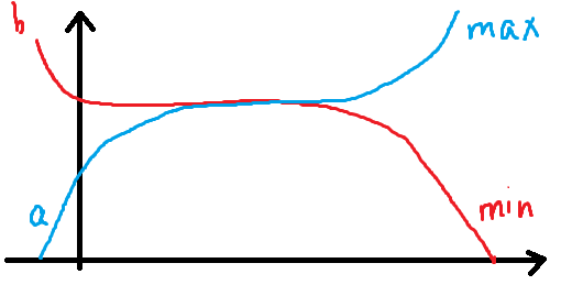 当\(l\)固定,向后求最大和最小,min满足的一定是一个单调不增的函数,max满足的一定是个单调不减的函数,两个函数之间交叠的部分,就是我们可取的 \(r\) .
