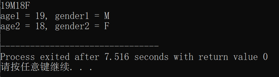 #include<stdio.h> int main() { int age1, age2; char gender1, gender2; scanf("%d%c%d%c", &age1, &gender1, &age2, &gender2); printf("age1 = %d, gender1 = %c\n", age1, gender1); printf("age2 = %d, gender2 = %c\n", age2, gender2); return 0; }