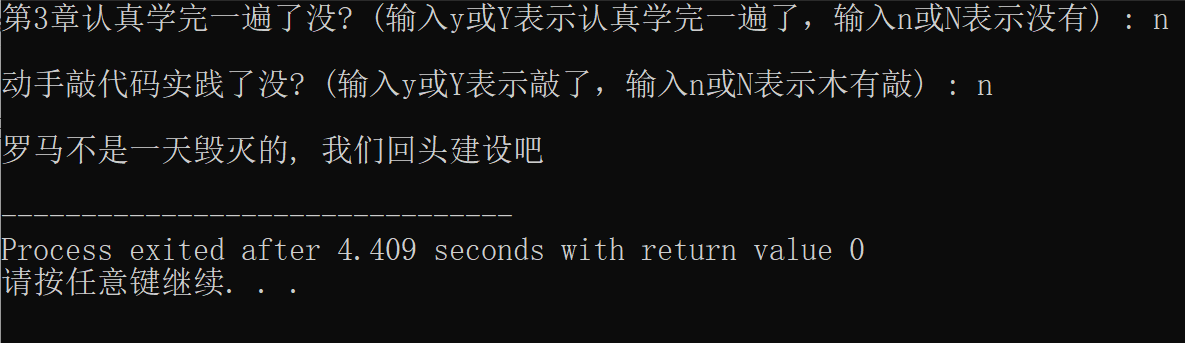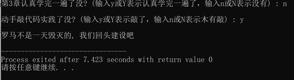 #include<stdio.h> int main() { char ans1, ans2; printf("第3章认真学完一遍了没? (输入y或Y表示认真学完一遍了,输入n或N表示没有) : "); ans1 = getchar(); // 从键盘输入一个字符,赋值给ans1 getchar(); // 思考这里为什么要加这一行。试着去掉这一行,看看对运行有没有影响。 printf("\n动手敲代码实践了没? (输入y或Y表示敲了,输入n或N表示木有敲) : "); ans2 = getchar(); if ((ans1=='y'||ans1=='Y')&&(ans2=='y'||ans2=='Y') )// 待补足,判断用户回答ans1和ans2都是小写y或大写Y printf("\n罗马不是一天建成的, 继续保持哦:)\n"); else printf("\n罗马不是一天毁灭的, 我们回头建设吧\n"); return 0; }