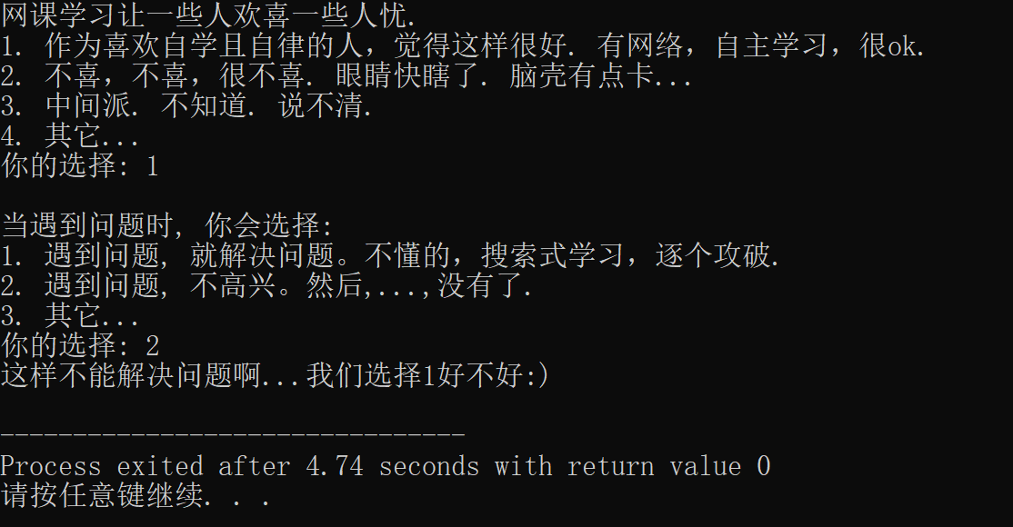#include<stdio.h> int main() { int answer; char words[5000]; printf("网课学习让一些人欢喜一些人忧.\n"); printf("1. 作为喜欢自学且自律的人,觉得这样很好. 有网络,自主学习,很ok.\n"); printf("2. 不喜,不喜,很不喜. 眼睛快瞎了. 脑壳有点卡...\n"); printf("3. 中间派. 不知道. 说不清.\n"); printf("4. 其它...\n"); printf("你的选择: "); scanf("%d", &answer); if(answer==4) { printf("请补充说明你的想法: \n"); getchar(); // 这行代码为什么放在这里,如果去掉了,会怎么样? gets(words); // 从键盘输入你的想法,输完后,敲回车键 } printf("\n"); printf("当遇到问题时, 你会选择:\n"); printf("1. 遇到问题, 就解决问题。不懂的,搜索式学习,逐个攻破.\n"); printf("2. 遇到问题, 不高兴。然后,...,没有了.\n"); printf("3. 其它...\n"); printf("你的选择: "); scanf("%d", &answer); if(answer==1) printf(":)\n"); else if(answer==2) printf("这样不能解决问题啊...我们选择1好不好:)\n"); else if(answer==3) { printf("请补充说明你的想法: \n"); getchar(); // 这行代码为什么放在这里,如果去掉了,会怎么样? gets(words); // 从键盘输入你的想法,输完后,敲回车键 } return 0; }