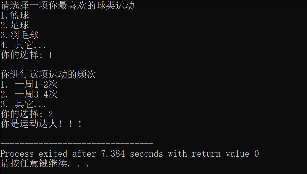 #include<stdio.h> int main() { int answer; char words[5000]; printf("请选择一项你最喜欢的球类运动\n"); printf("1.篮球\n"); printf("2.足球\n"); printf("3.羽毛球\n"); printf("4. 其它...\n"); printf("你的选择: "); scanf("%d", &answer); if(answer==4) { printf("请补充说明你的想法: \n"); getchar(); // 这行代码为什么放在这里,如果去掉了,会怎么样? gets(words); // 从键盘输入你的想法,输完后,敲回车键 } printf("\n"); printf("你进行这项运动的频次\n"); printf("1. 一周1-2次\n"); printf("2. 一周3-4次\n"); printf("3. 其它...\n"); printf("你的选择: "); scanf("%d", &answer); if(answer==1) printf(":)\n"); else if(answer==2) printf("你是运动达人!!!\n"); else if(answer==3) { printf("请补充说明你的想法: \n"); getchar(); // 这行代码为什么放在这里,如果去掉了,会怎么样? gets(words); // 从键盘输入你的想法,输完后,敲回车键 } return 0; }