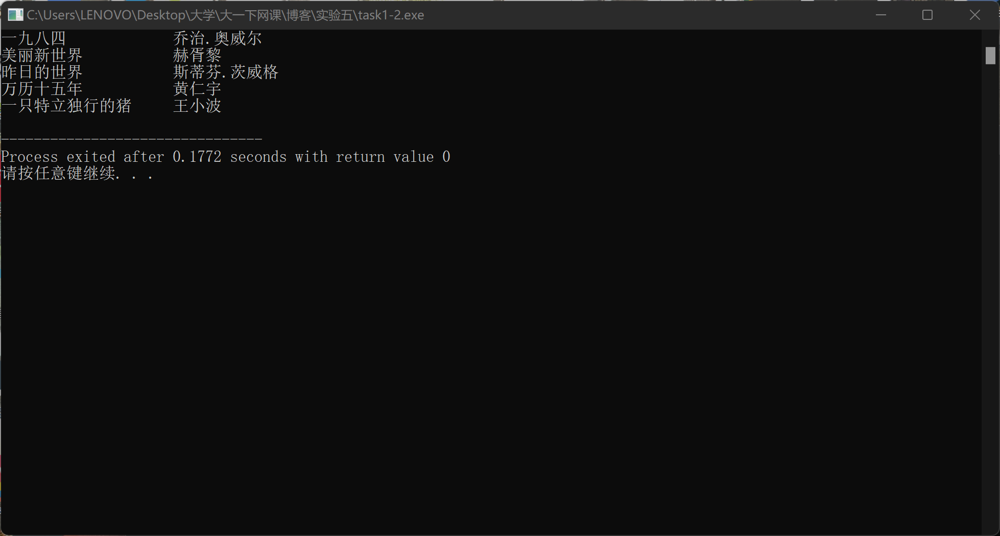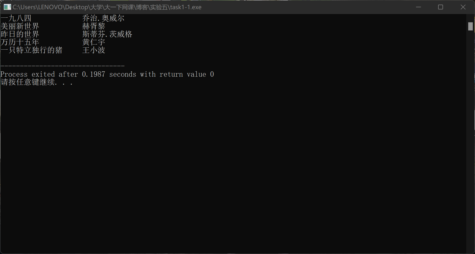 #include <stdio.h> #define N 5 #define M 80 typedef struct { char name[M]; // 书名 char author[M]; // 作者 }Book; int main() { Book x[N]={ {"一九八四", "乔治.奥威尔"}, {"美丽新世界", "赫胥黎"}, {"昨日的世界", "斯蒂芬.茨威格"}, {"万历十五年", "黄仁宇"}, {"一只特立独行的猪", "王小波"} }; int i; FILE *fp; // 以写的方式打开文本文件data1.txt fp = fopen("data1.txt", "w"); // 如果打开文件失败,输出提示信息并返回 if(fp==NULL) { printf("fail to open file\n"); return 1; } // 将结构体数组x中的图书信息写到fp指向的文件data1.txt // 同时也输出到屏幕上 for(i=0; i<N; ++i) { fprintf(fp, "%-20s %-20s\n", x[i].name, x[i].author); printf("%-20s %-20s\n", x[i].name, x[i].author); } fclose(fp); return 0; }