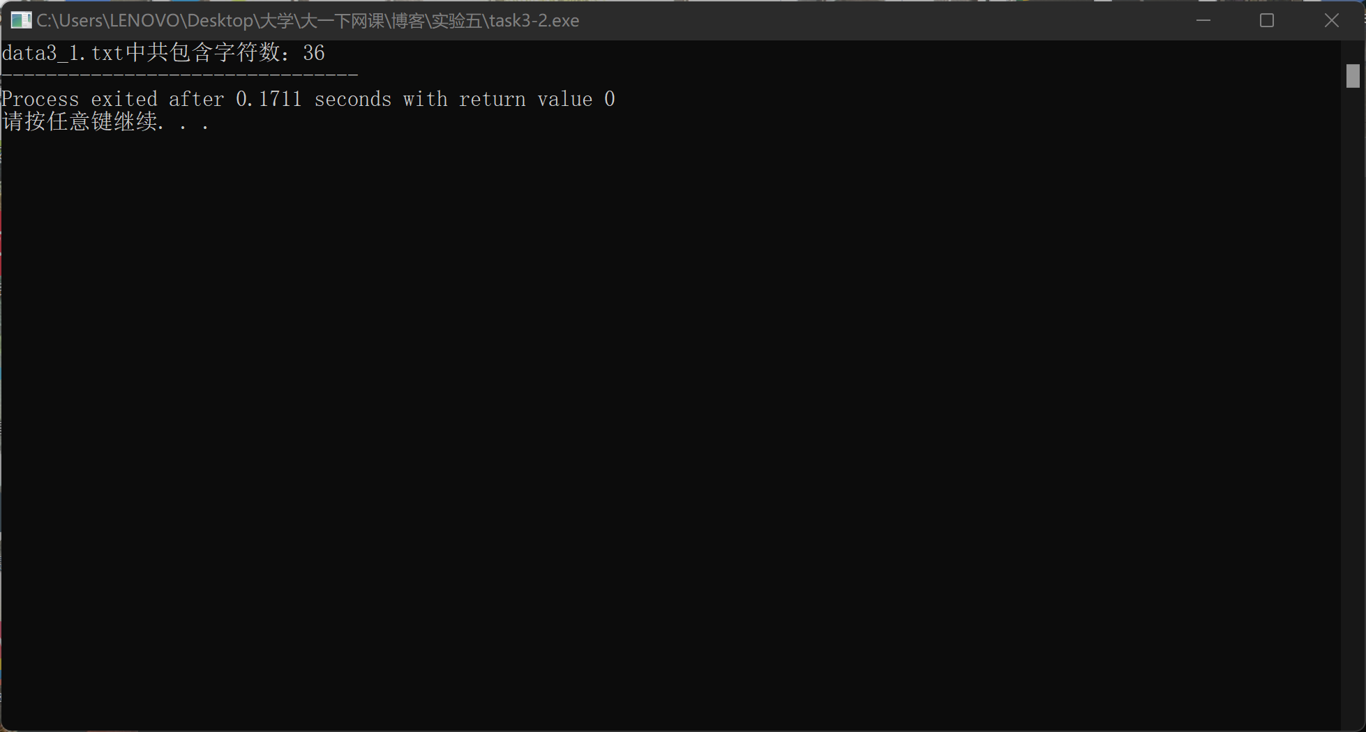 #include <stdio.h> int main() { FILE *fin; char ch; int i=0; // 以只读、文本方式打开文件data3_1.txt fin = fopen("data3_1.txt", "r"); // 如果打开失败,输出提示信息并返回 if(fin == NULL) { printf("fail to open data3_1.txt\n"); return 1; } // 当fin指向的文件data1_txt没有结束时 while( !feof(fin) ) { // 从fin指向的文件data1_txt读取单个字符 ch = fgetc(fin); if(ch != ' ' && ch != '\n' && ch != '\t'&& ch!=EOF) { i++; } } printf("data3_1.txt中共包含字符数:%d",i); fclose(fin); return 0; }