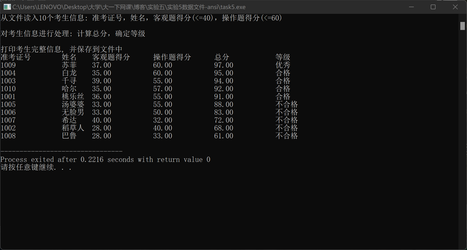 #include <stdio.h> #include <string.h> #include <stdlib.h> #define N 10 typedef struct { long int id; char name[20]; float objective; /*客观题得分*/ float subjective; /*操作题得分*/ float sum; char level[10]; } STU; // 函数声明 void input(STU s[], int n); void output(STU s[], int n); void process(STU s[], int n); int main() { STU stu[N]; printf("从文件读入%d个考生信息: 准考证号,姓名,客观题得分(<=40),操作题得分(<=60)\n", N); input(stu, N); printf("\n对考生信息进行处理: 计算总分,确定等级\n"); process(stu, N); printf("\n打印考生完整信息, 并保存到文件中"); output(stu, N); return 0; } // 从文本文件examinee.txt读入考生信息:准考证号,姓名,客观题得分,操作题得分 void input(STU s[], int n) { int i; FILE *fin; fin = fopen("examinee.txt", "r"); if (fin == NULL) { printf("fail to open file\n"); exit(0); } while (!feof(fin)) { for (i = 0; i < n; i++) fscanf(fin, "%ld %s %f %f", &s[i].id, s[i].name, &s[i].objective, &s[i].subjective); } fclose(fin); } //输出考生完整信息: 准考证号,姓名,客观题得分,操作题得分,总分,等级 // 不仅输出到屏幕上,还写到文本文件result.txt中 void output(STU s[], int n) { FILE *fout; int i; // 输出到屏幕 printf("\n"); printf("准考证号\t姓名\t客观题得分\t操作题得分\t总分\t\t等级\n"); for (i = 0; i < n; i++) printf("%ld\t\t%s\t%.2f\t\t%.2f\t\t%.2f\t\t%s\n", s[i].id, s[i].name, s[i].objective, s[i].subjective, s[i].sum, s[i].level); // 保存到文件 fout = fopen("result.txt", "w"); if (!fout) { printf("fail to open or create result.txt\n"); exit(0); } fprintf(fout, "准考证号\t\t姓名\t客观题得分\t操作题得分\t总分\t\t等级\n"); for (i = 0; i < n; i++) fprintf(fout, "%ld\t\t%s\t%.2f\t\t%.2f\t\t%.2f\t\t%s\n", s[i].id, s[i].name, s[i].objective, s[i].subjective, s[i].sum, s[i].level); fclose(fout); } // 对考生信息进行处理:计算总分,排序,确定等级 void process(STU s[], int n) { int i,j; STU t; for(i=0;i<n;i++) { s[i].sum=(s[i].objective)+(s[i].subjective); } for(j=0;j<n-1;j++) for(i=0;i<n-j-1;i++) if(s[i].sum<s[i+1].sum) { t=s[i]; s[i]=s[i+1]; s[i+1]=t; } for(i=0;i<1;i++) { strcpy( s[i].level,"优秀"); } for(;i>=1&&i<5;i++) strcpy(s[i].level,"合格"); for(;i<n;i++) strcpy(s[i].level,"不合格"); }